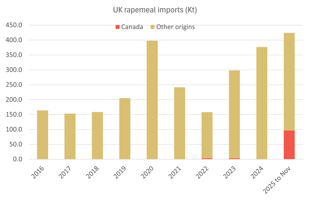 The rapemeal market was already on the rise, buoyed by factors including Beijing’s agreement to ditch a punitive tariff on Canadian canola meal, of which China has historically been a key buyer. Canada in the meantime diverted canola meal to Europe, including the UK, which took 96.5Kt for 2025 up to November, an unusually large volume.