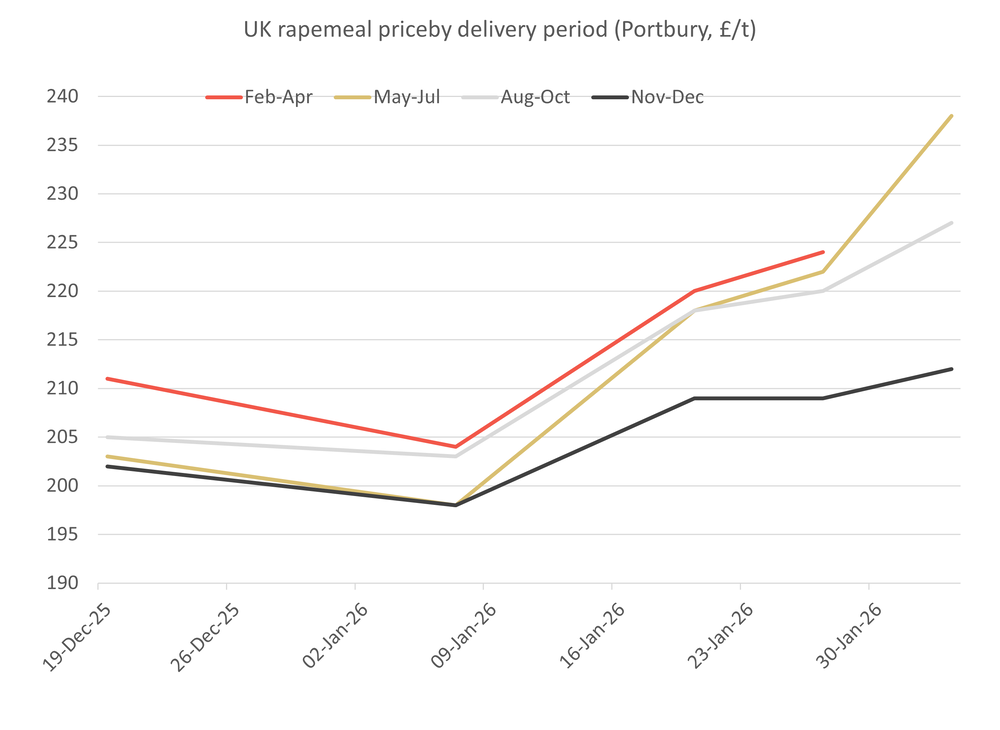 Rapemeal for May-July is offered at £238/t, basis Portbury, CRM Agri data show.