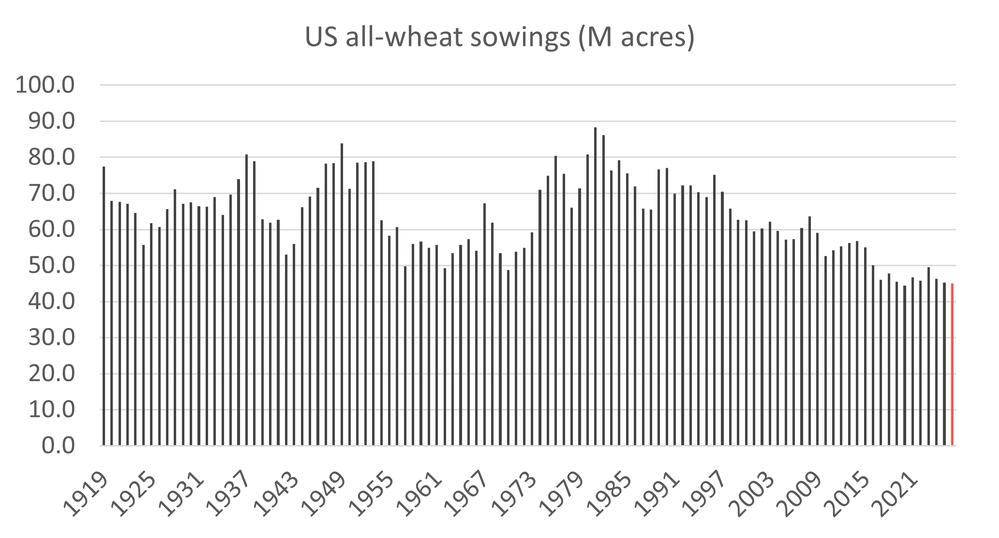 The USDA, in initial 2026/27 US crop estimates unveiled at its annual Outlook Forum, forecast US wheat sowings falling by 300K acres year on year t0 45.0M acres - the second smallest area on data going back to World War I. (The USDA unveiled its first US winter wheat area estimate last month.)
