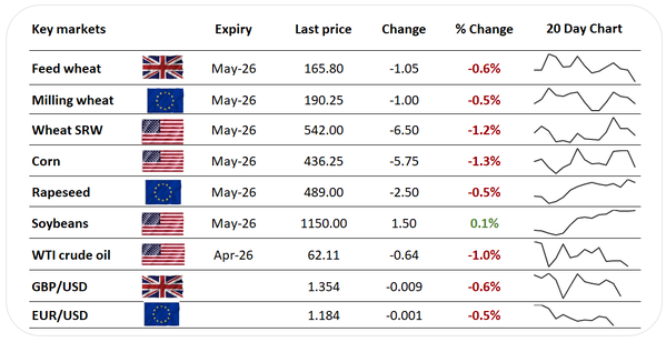 Paris milling wheat for May-26 traded down 0.5% in late deals, while London feed wheat for May-26 shed 0.8%.