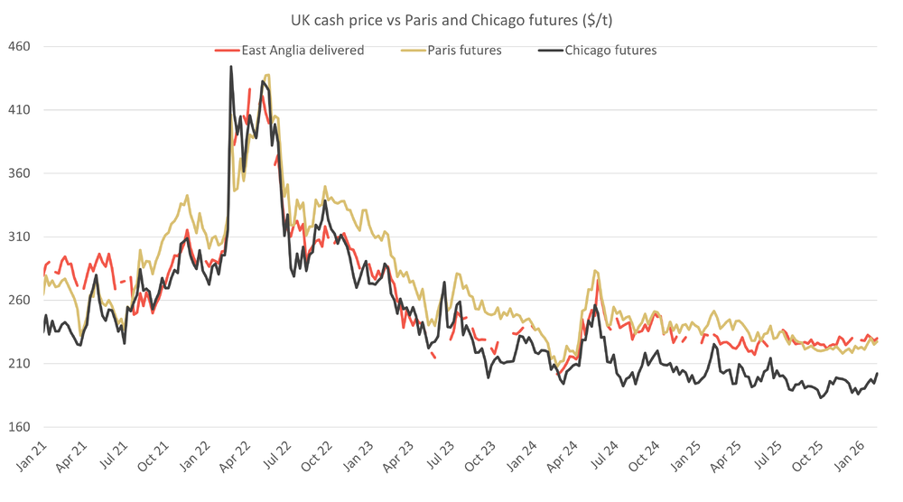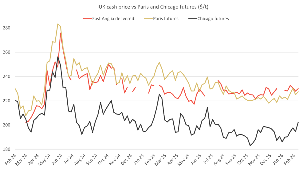 Even then, the current East Anglia premium of about $28/t to Chicago futures is more than twice the five-year average of £13/t or so.