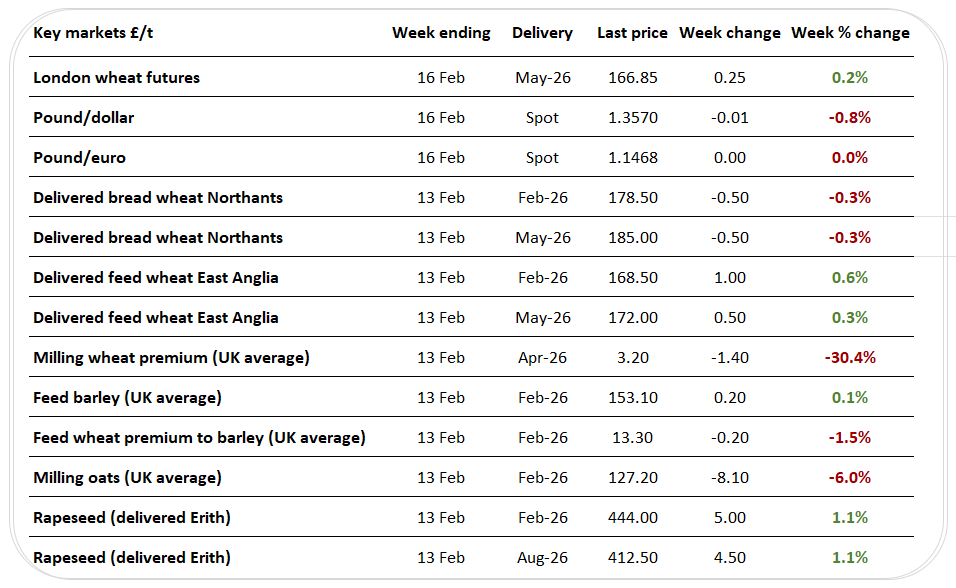 *Rapeseed prices extended their run of unbroken weekly gains for 2026, to hit £444/t March and £410 Harvest, as delivered to Erith, an eight-month high. Headway remains supported by a modest pace of EU imports, and geopolitical factors such as China’s return to buying Canadian canola.